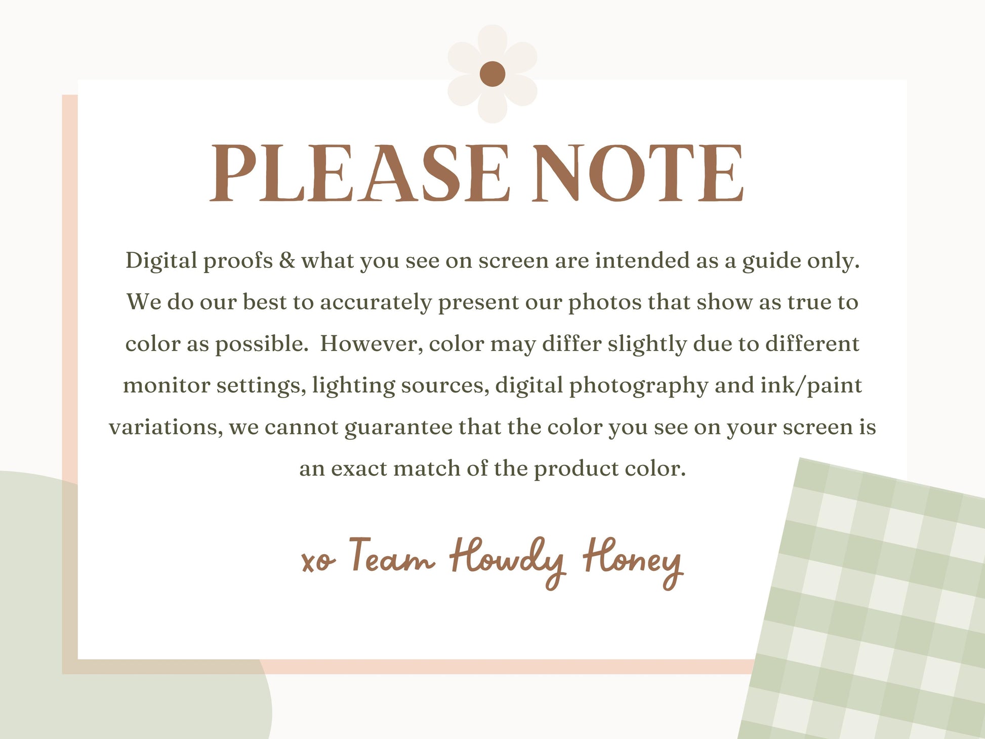 Please inspect your order immediately upon receipt. If your item is defective, damaged, or incorrect, contact us within 72 hours so we can assess the situation and address it accordingly. For any questions, feel free to reach out to us at hello@howdyhoneytransfers.com.
