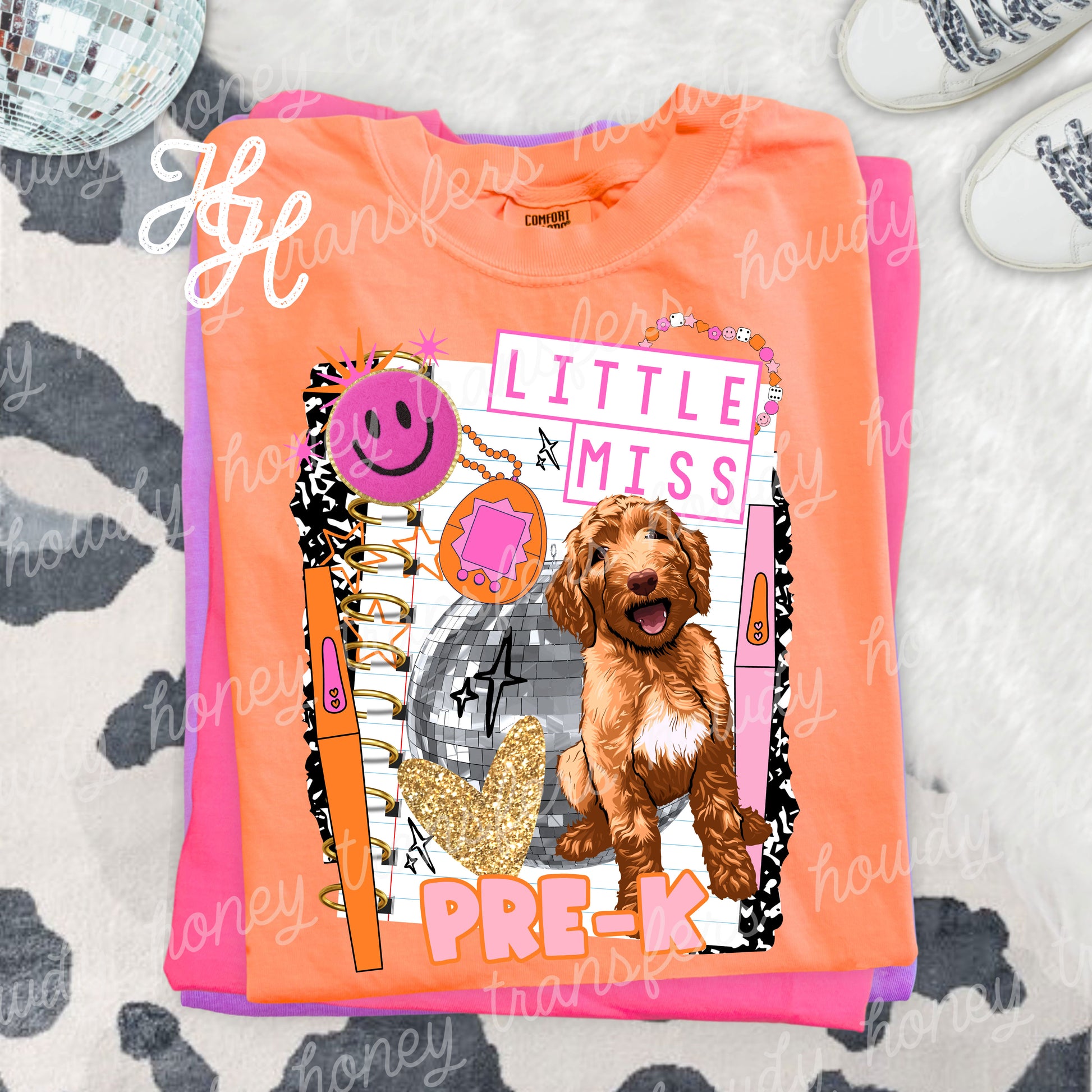 Little Miss Pre-K Shirt Transfer. Please note that this item is a transfer only and does not include a shirt. A heat press is necessary for proper application, as standard household irons or easy presses are not suitable.