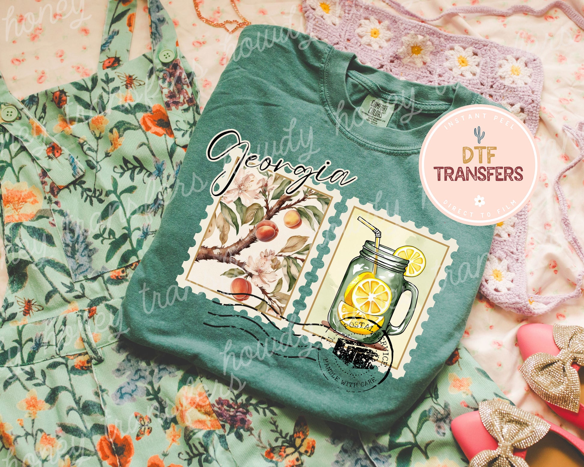 Home State of Georgia Postcard Stamp DTF Transfer Print. Please note that this item is a transfer only and does not include a shirt. A heat press is necessary for proper application, as standard household irons or easy presses are not suitable.