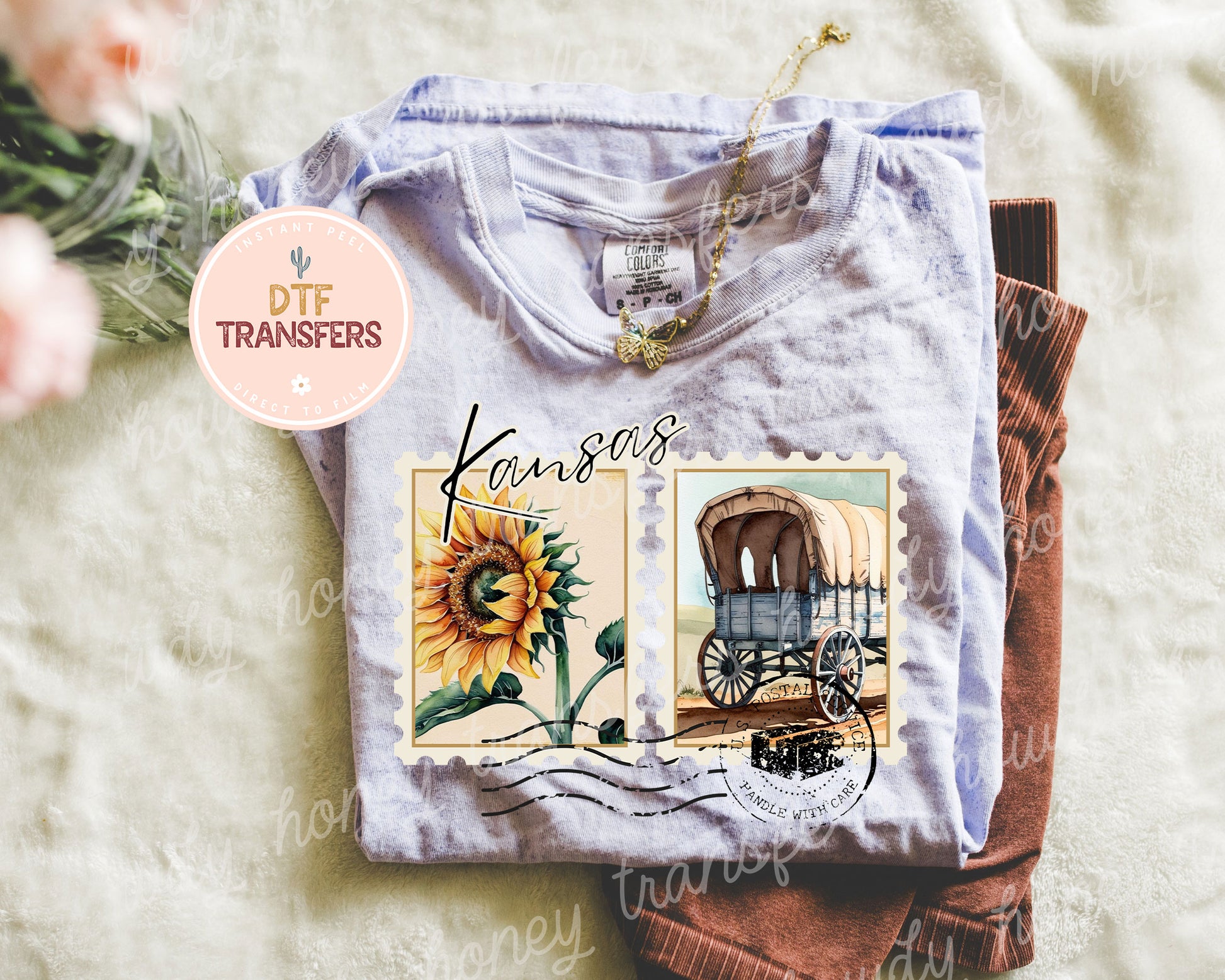 Home State of Kansas Postcard Stamp DTF Transfer Print. Please note that this item is a transfer only and does not include a shirt. A heat press is necessary for proper application, as standard household irons or easy presses are not suitable.